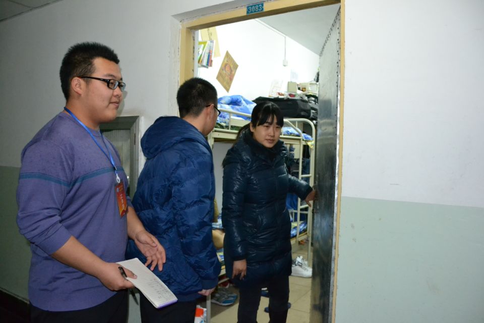 2014年12月10日晚,中文a片 党委副书记刘光老师,团委书记王宇鹏老师,学生科科长张丽花老师,学生科段雪倩老师、李晓彧老师、杨博炜老师、祁亚芳老师带领生活部人员对学生宿舍进行了检查,各宿舍情况良好,查寝结果也令人满意,特此通报。