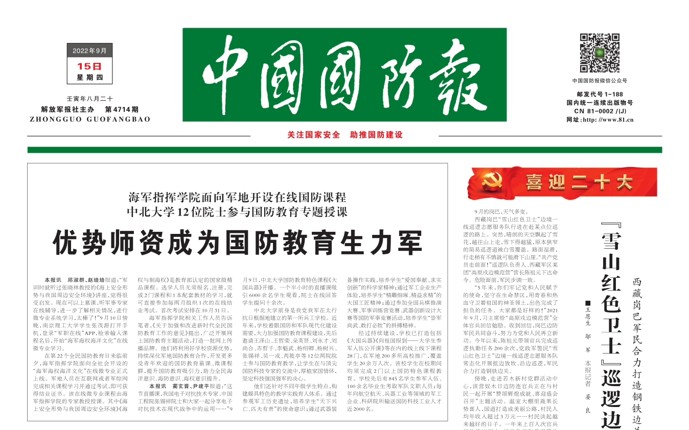 今天出版的《中国国防版》头版头条以“优势师资成为国防教育生力军---中文a片