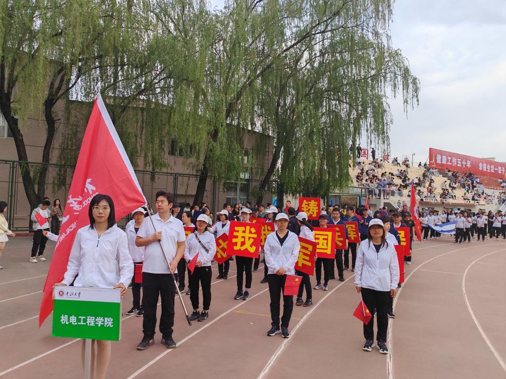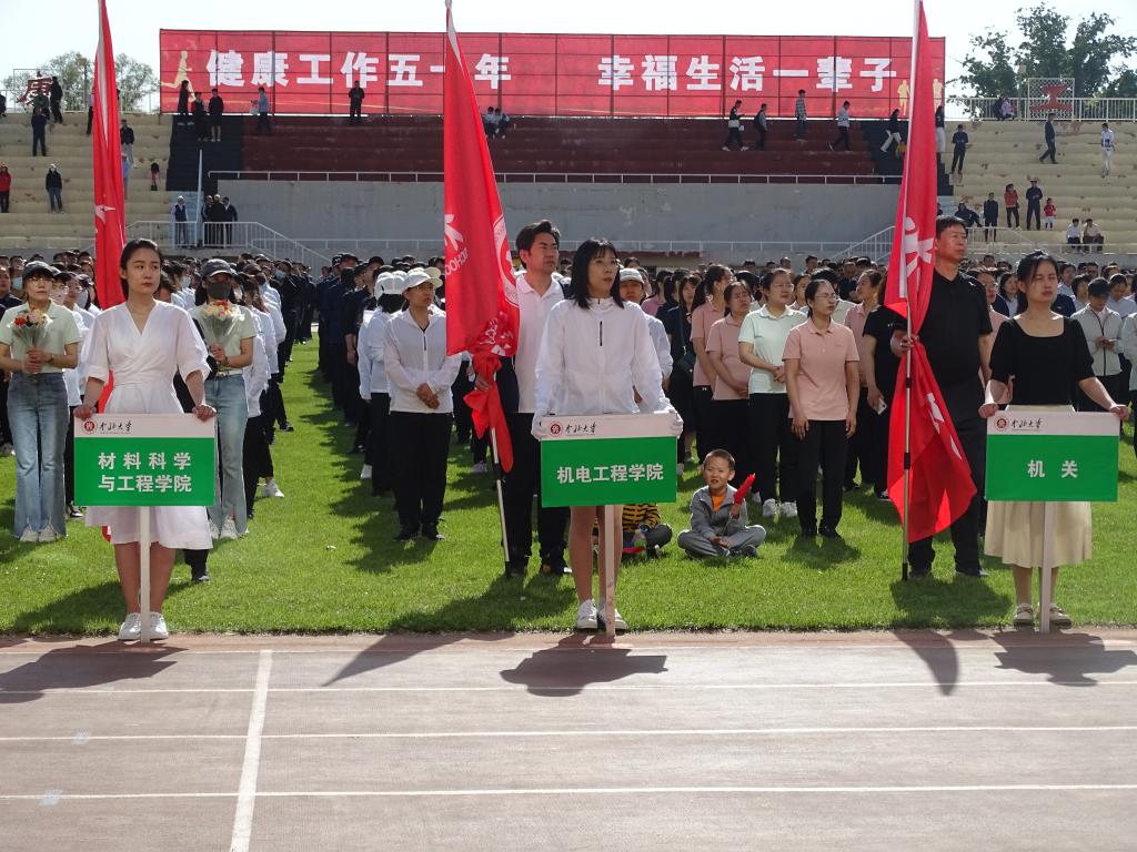 在本次运动会的开幕式上,所有参赛教职工身着统一的运动服,依次入场。