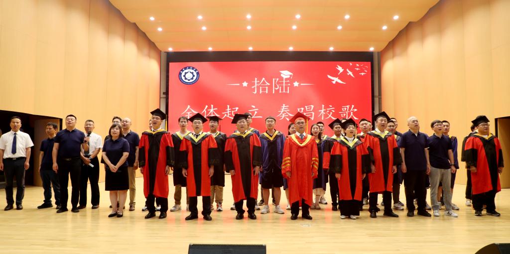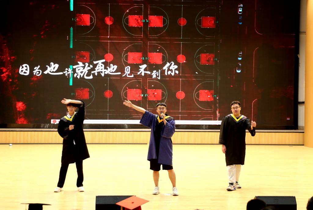 拨穗发证环节结束后,毕业生代表和毕业班班主任分别送上合唱歌曲《再见》和《祝你一路顺风》,离别氛围达到高峰,最后整个仪式在全体高唱校歌中圆满结束。