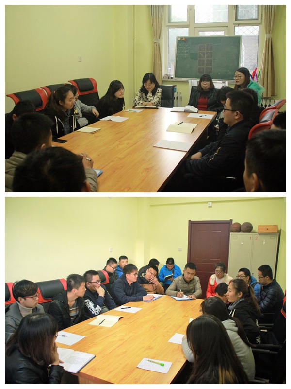 随后,张老师以加强班级凝聚力为主导,加强个人集体感为中心,对各位导员的班级工作进行了指导。在班会方面,倡导各班应举办以文明礼仪、三生观、核心价值观及有深远人生意义的主题班会,将班会落到实处。在导员方面,张老师强调了导员的指导性、沟通性和持久性,切实将导员工作落到实处。然后各班导员依次反映了各班在学习和生活中遇到的问题,两位老师分别对各班存在的问题提出了意见和建议。
