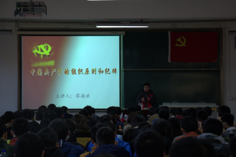 廖老师从党的组织原则和纪律两个方面分别进行了讲解。首先,他向各位入党积极分子介绍了我们党的组织机构和以民主集中制为核心的组织原则,同时结合我们党在建立发展过程中遇到的问题,着重强调了民主集中制的重要性。他指出:“集中是民主基础上的集中,民主是集中指导下的民主,二者辩证统一,相互制约。”接着,廖老师以党和国家大力度的反腐为例,讲解了党的纪律性。告诫各位入党积极分子,要做一名合格的党员一定要有纪律约束。