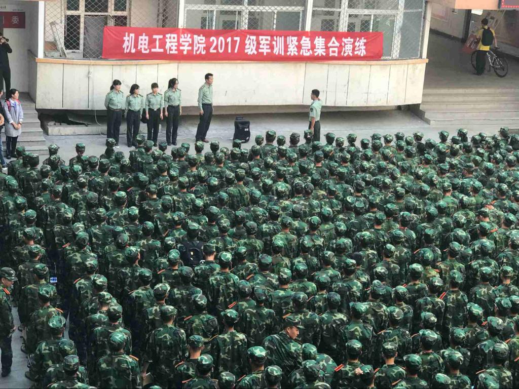 全体新生迅速整理衣装,加快脚步,紧张而有序地撤离宿舍,跑步到达集合地点。三分钟内全体新生即集合完毕。