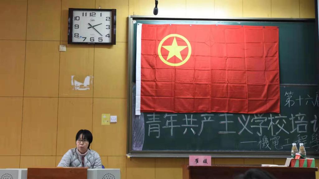 上午8时青工校培训开班典礼开始,全体参会人员奏唱国歌。之后,李晶晶老师做动员讲话,并向上一任学生干部颁发聘书。接着,团委副书记张鑫泽代表学生干部发言,干部代表张程皓带领大家宣誓。最后,主持人宣读青年共产主义学校培训细则。青工校培训正式开始。