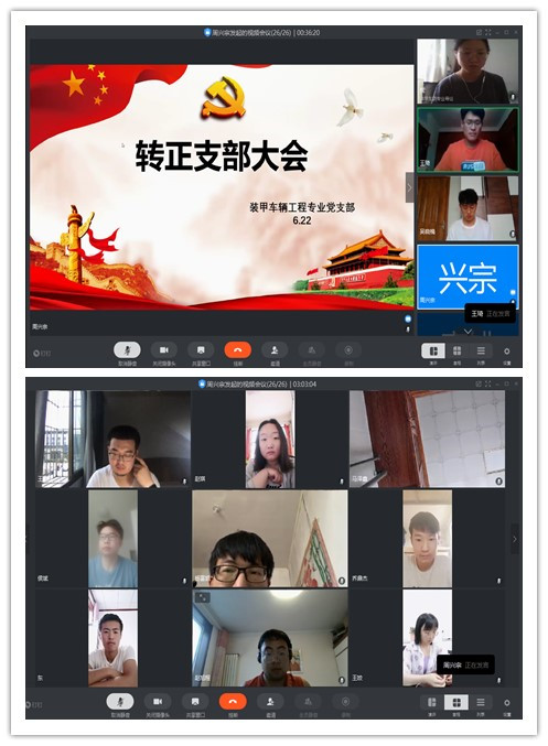 2020年6月27日下午三点,装甲车辆工程专业党支部召开了转正支部大会,对李昊东、杨富凯等6名预备党员按期转为中共正式党员进行讨论和表决,会议应到26人,实到26人,其中正式党员12人。本次会议由支部副书记周兴宗同志主持。