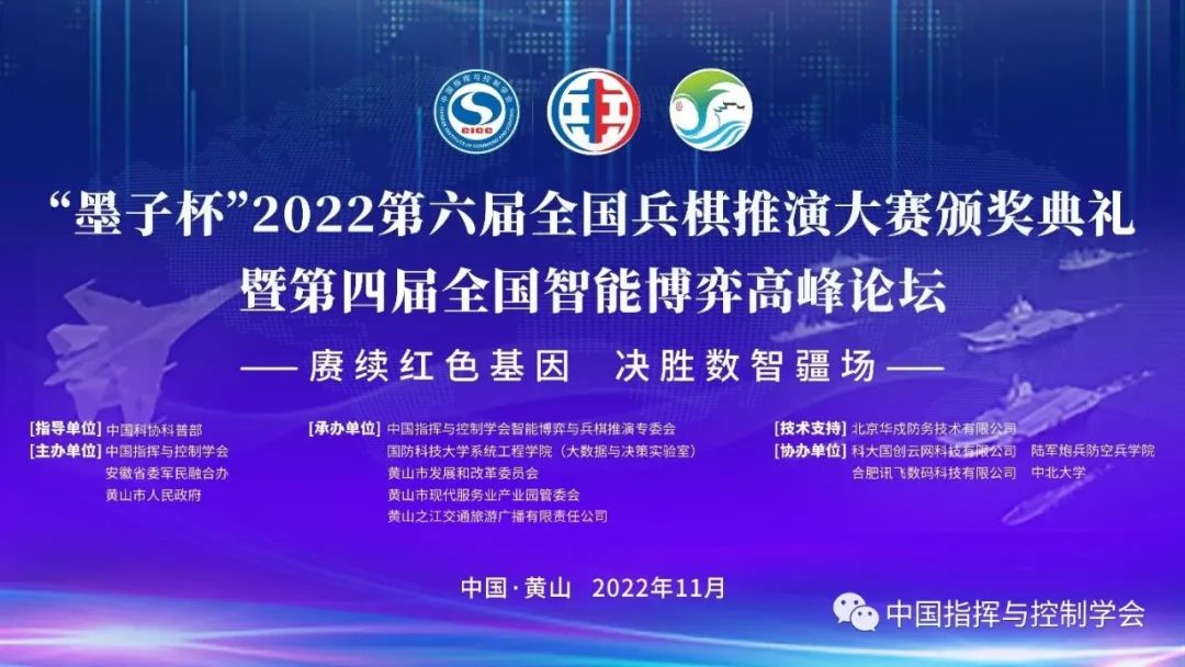2022年11月23日至26日,“墨子杯”2022第六届全国兵棋推演大赛总决赛暨第四届全国智能博弈高峰论坛在安徽省黄山市屯溪区成功举办。全国10多个省的近百名选手经过激烈角逐,决出冠、亚、季军。中国指挥与控制学会,安徽省委宣传部、黄山市政府,兵棋推演和智能博弈领域有关院校、研究院所、高技术企业的300余名专家、领导参加颁奖典礼和论坛等活动。近3万人次兵棋推演爱好者通过中国指挥与控制学会视频号直播观看了兵棋推演大赛总决赛实况。