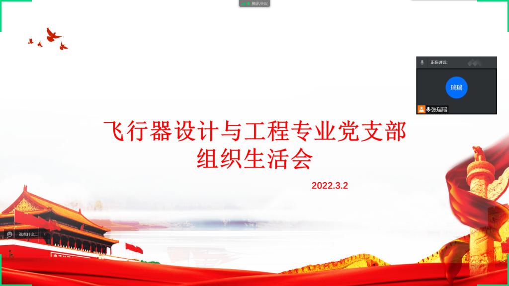 为提高党员素质,更好的对党员进行教育、管理和监督,以及增加支部内成员交流、增强支部凝聚力、战斗力,飞行器设计与工程专业党支部于2022年3月2日上午9:00,通过腾讯会议在现上召开此次组织生活会,开展批评与自我批评及民主评议党员工作。