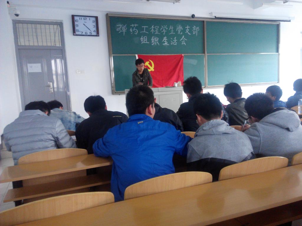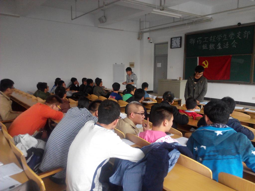 弹药工程与爆炸技术专业学生党支部在逸夫楼15402召开了弹药党支部转正与发展民主生活会。本次会议由支部书记刘帅同志主持,主要内容是2014年秋季转正和发展工作的部署,弹药支部所有成员参加了此次会议。