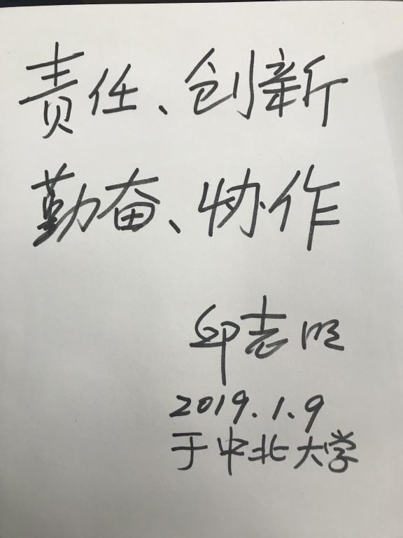 讲座后,李东光副校长进行了总结发言,希望同学们加强学习,掌握好本专业知识,将来更好的投身于军工事业,邱院士欣然为学院师生题词“责任、创新、勤奋、协作”,寄予厚望。