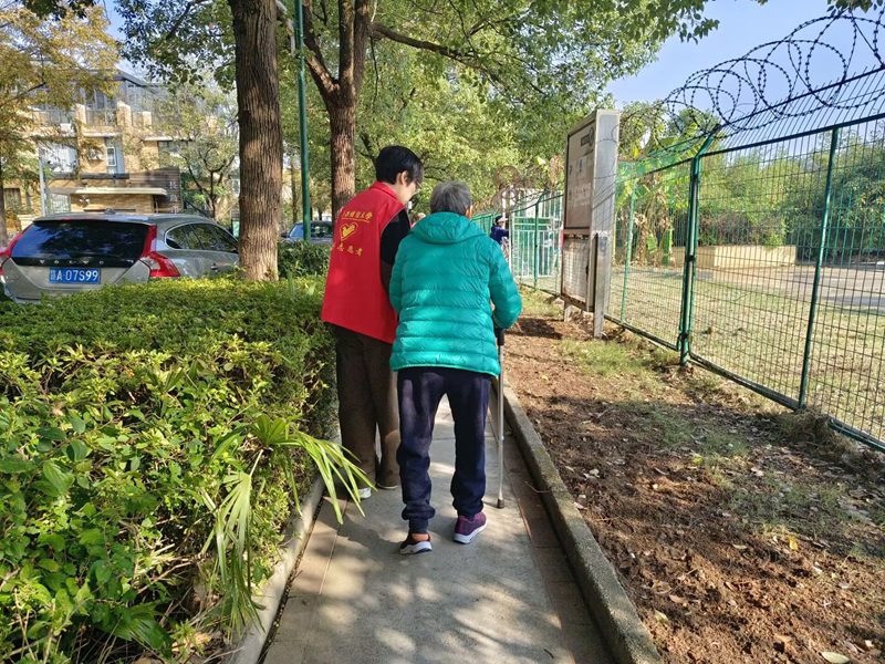 志愿者们抵达万科南社区嵌入式养老院,是时天气晴朗,养老院工作人员便提议在公园开展活动。随后,志愿者们搀扶着老人前往公园。