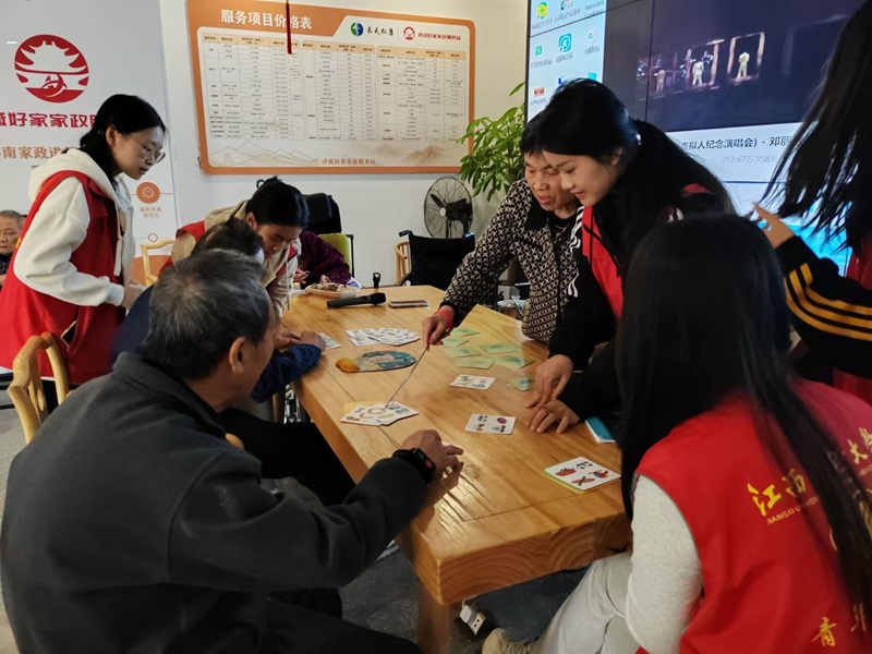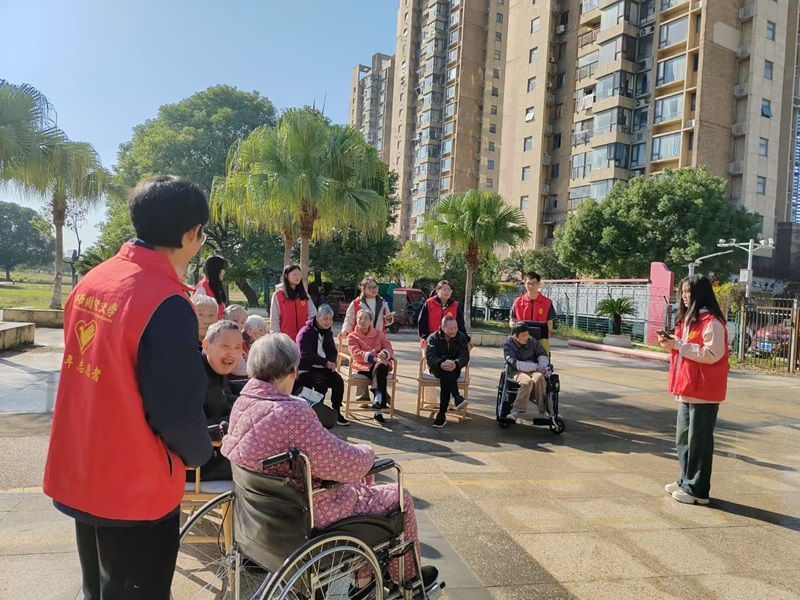 活动内容主要包括聊天陪伴、文艺表演、趣味游戏。在交流过程中,志愿者们围坐在老人身旁,眼神中满是专注与尊敬,他们微微倾身、耐心倾听、积极回应。老人也分享自己的人生经验、智慧和故事,关心着大学生的学业与未来规划。在一场场代际交流中,彼此都收获了爱与温暖。