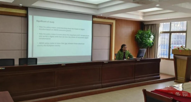On the morning of October 17th, Dean Au Yong Hui Nee of Faculty of Business and Finance of Universiti Tunku Abdul Rahman was invited to the Public Management Forum of the School of Public Finance and Public Administration, and gave an academic lecture entitled Study on the Impact of Digital Transformation on the Business Environment in Southeast Asia Nations for teachers and students in Conference Room 205 of the Finance and Taxation Building. Dean Zhang Zhongfang, Deputy Secretary Xie Lihua, Vice Dean Yang Daotian, teacher Liao Shaogang and other teachers, as well as some graduate students attended the lecture, which was presided over by Vice Dean Dai Lihua.